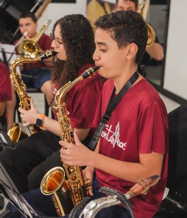 Aulas práticas com instrumentos de sopro.